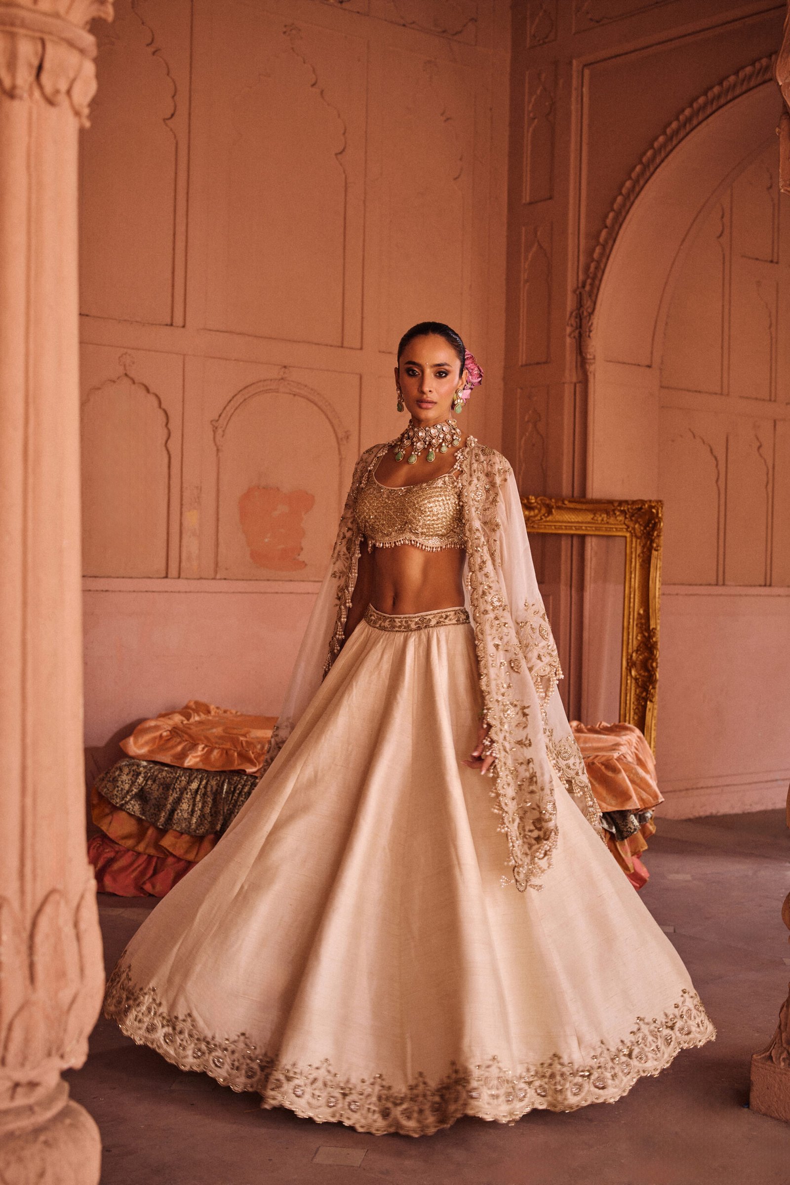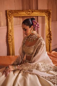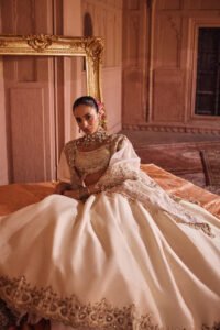The Khwaab Lehenga (“Dream Lehenga”) is where heritage meets a dreamlike softness. Its delicate structure and intricate, ethereal detailing offer contemporary sophistication while remaining deeply rooted in tradition. Experience the allure of a genuine couture fantasy.