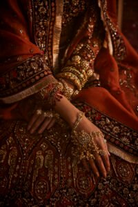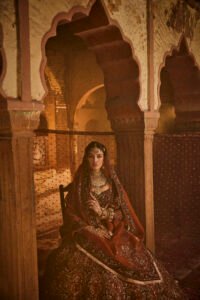 Inspired by the rich colors of dusk, the Sanjh Bridal ensemble is crafted from deep, royal-toned fabrics. The intense handwork beautifully illuminates the dark base, creating a look of profound sophistication. It’s an intimate masterpiece that celebrates India’s regal artistry, perfect for an elegant, powerful evening ceremony.