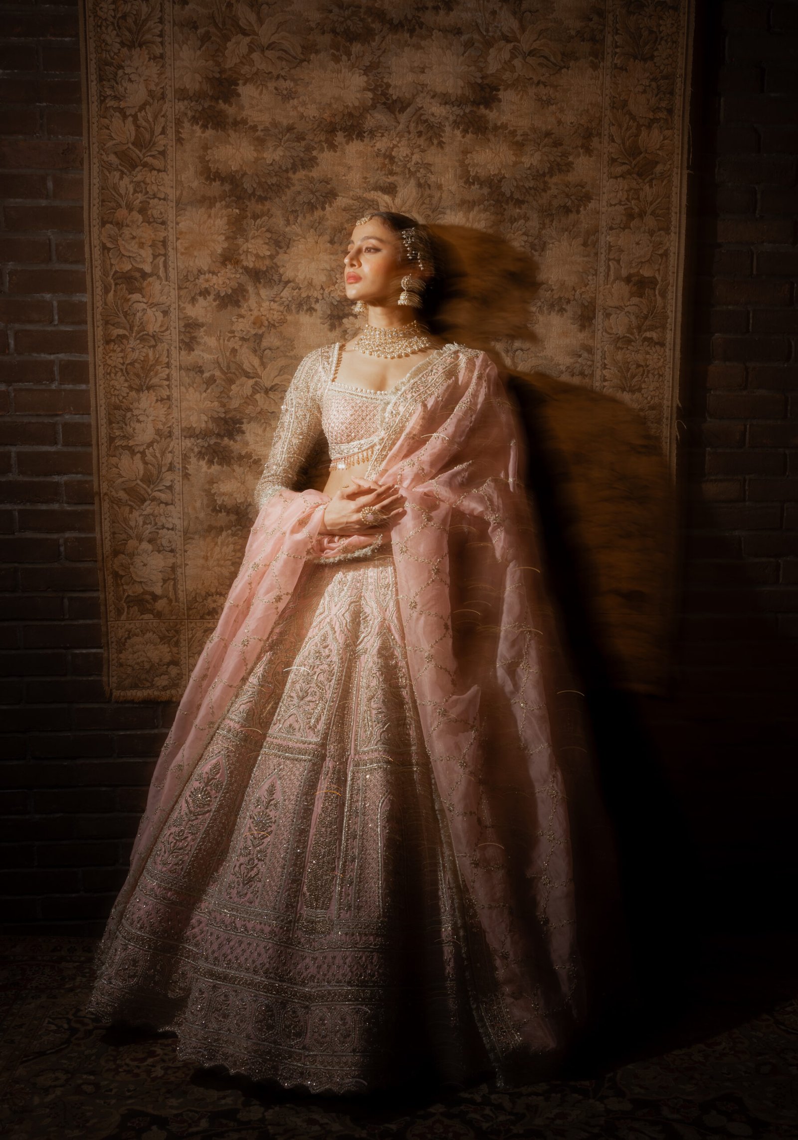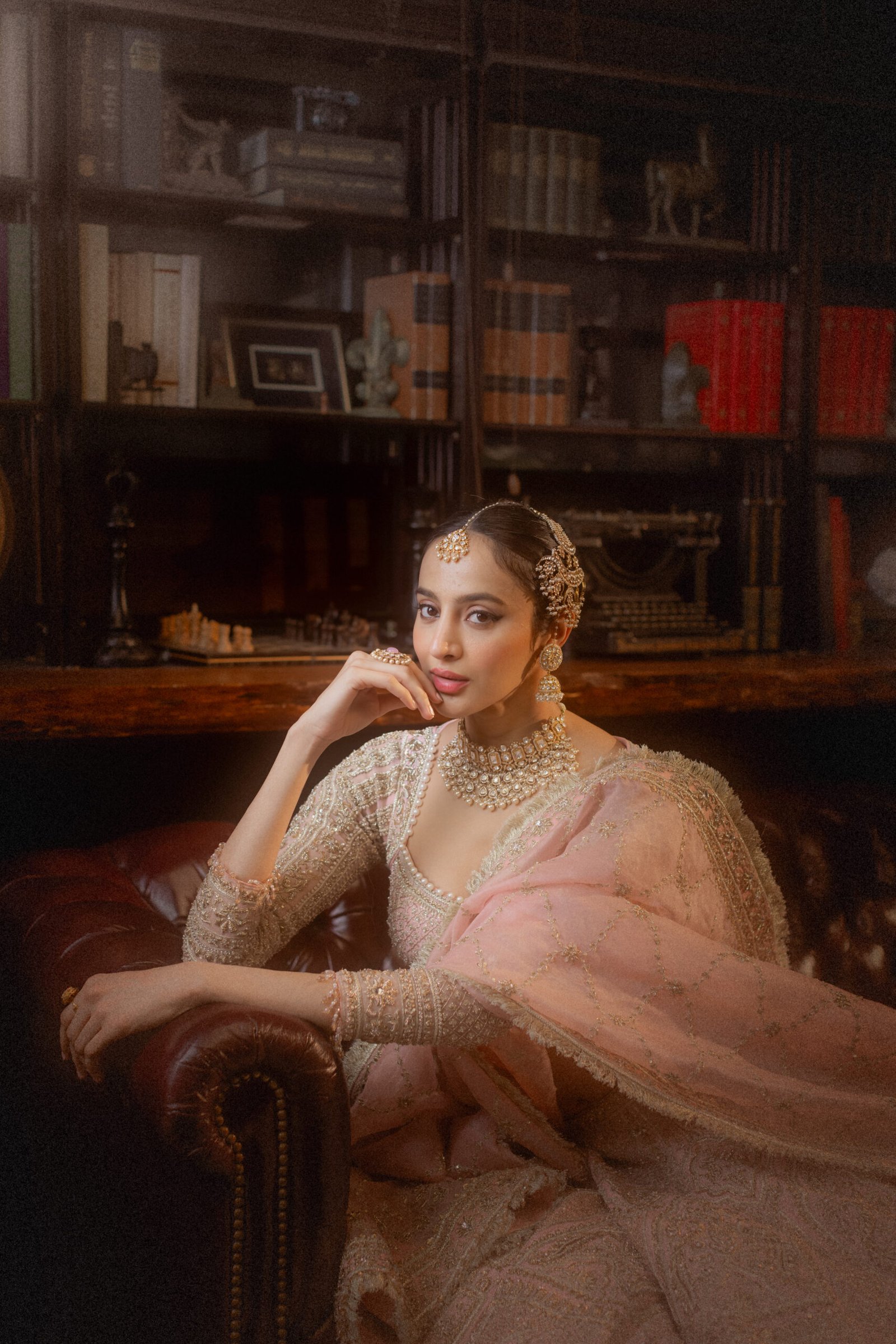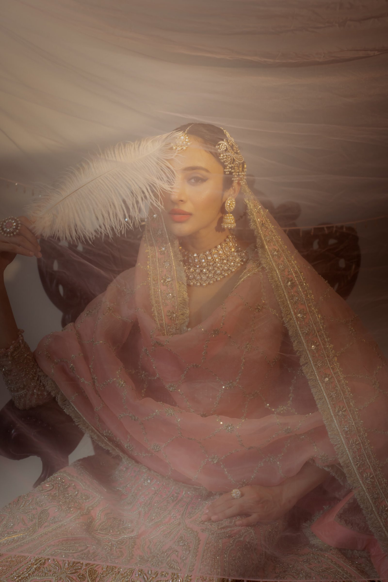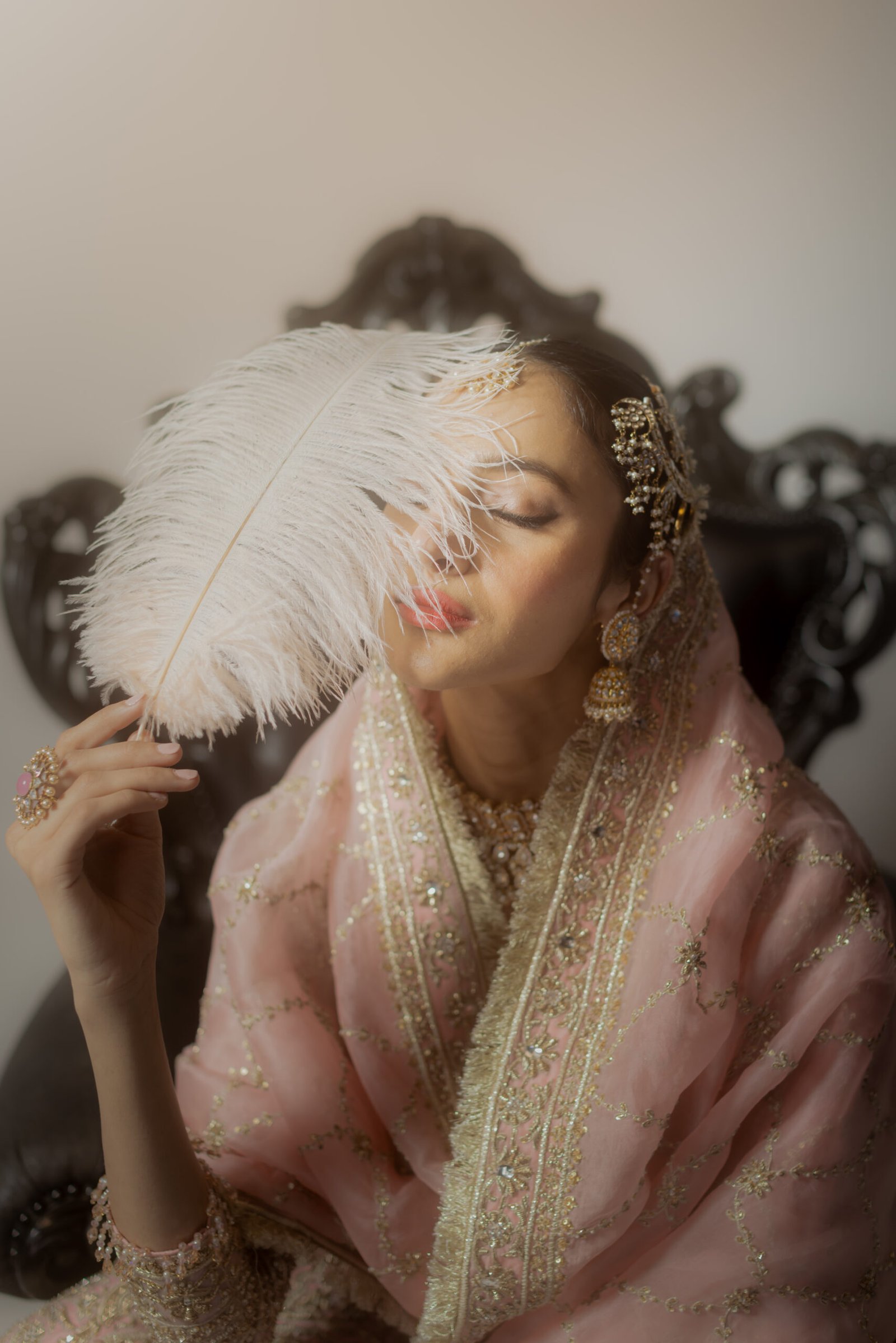 Shaheen Pink Bridal is a testament to vibrant, powerful femininity. This ensemble captures the essence of traditional Indian artistry within a bold yet luxurious pastel pink. Its rich, exclusive motif and balanced volume offer a statement of uncompromising couture excellence, perfect for the bride who cherishes heritage with a hint of vibrant allure.