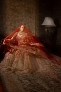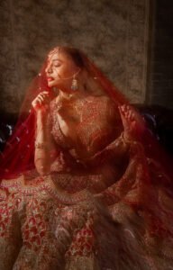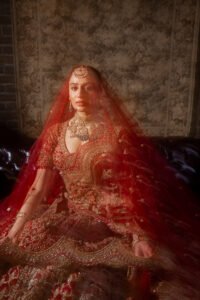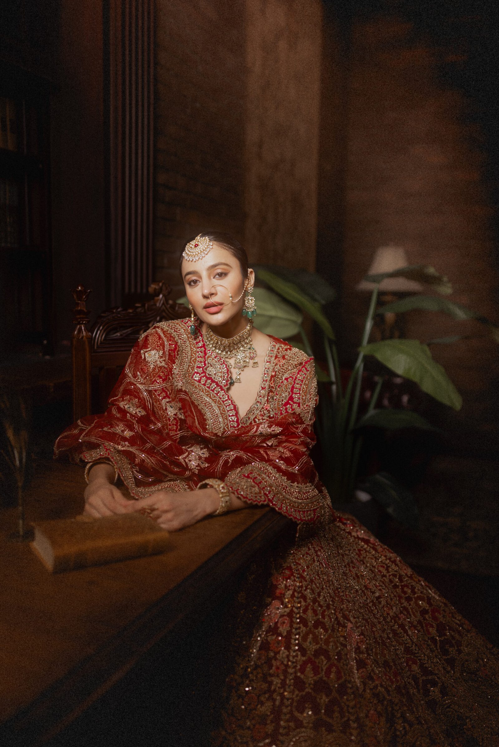 The Shaheen Red Bridal is a statement of magnificent, vibrant royalty. Crafted from opulent silk, the fabric is densely embroidered with an exclusive motif that balances volume with refined couture finesse. This ensemble is designed to make the bride own the moment—a powerful declaration of bold, yet elegant, couture excellence.