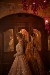 The Sitara Bridal ensemble is designed to make the bride an incandescent star. Crafted in a delicate pastel hue, the entire silhouette is adorned with dense, glistening zari and sequin work, creating a breathtaking shimmer. This piece marries uncompromising quality with a fluid, captivating grace, ensuring a truly majestic appearance.