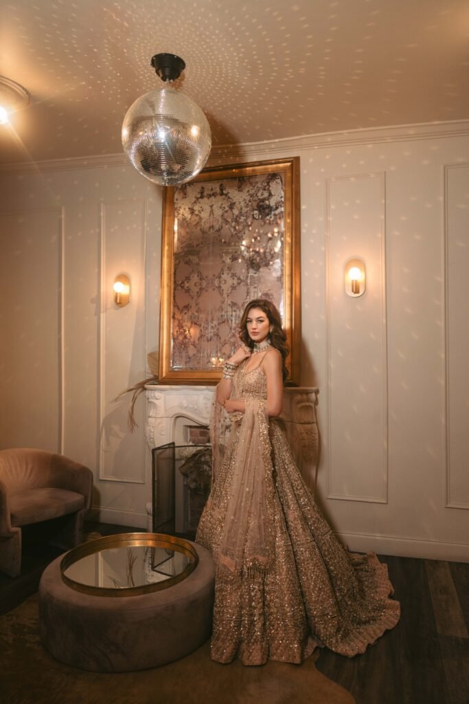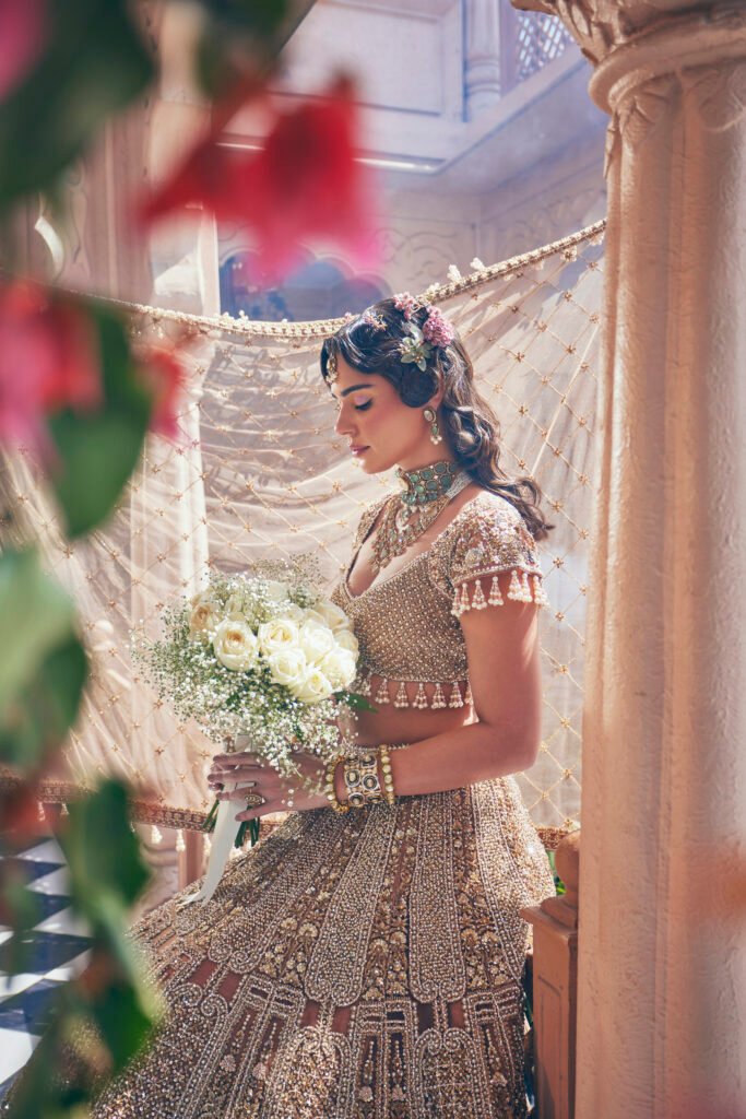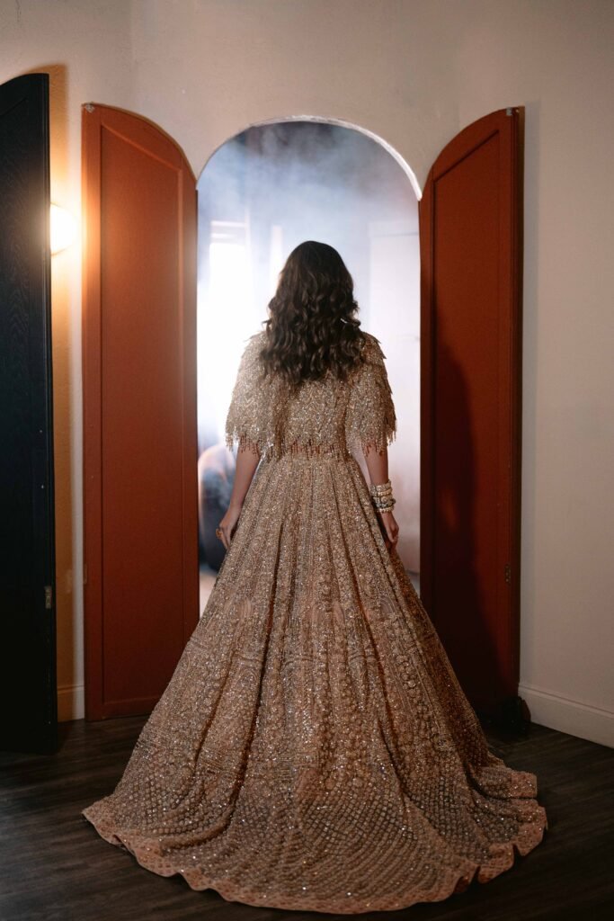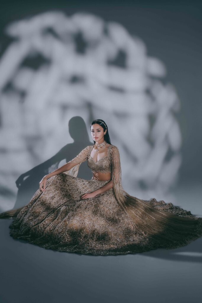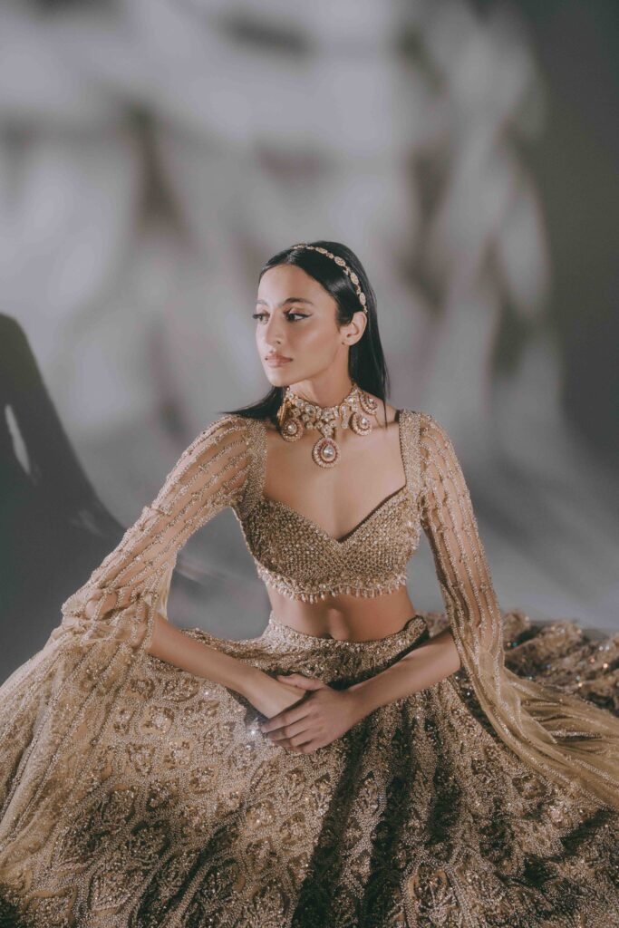 The Bella Bridal ensemble is the embodiment of a regal fantasy. Crafted for the grandest occasion, this piece is an intricate tapestry of the finest silk and thousands of meticulously placed hand-sewn crystals and zardozi.