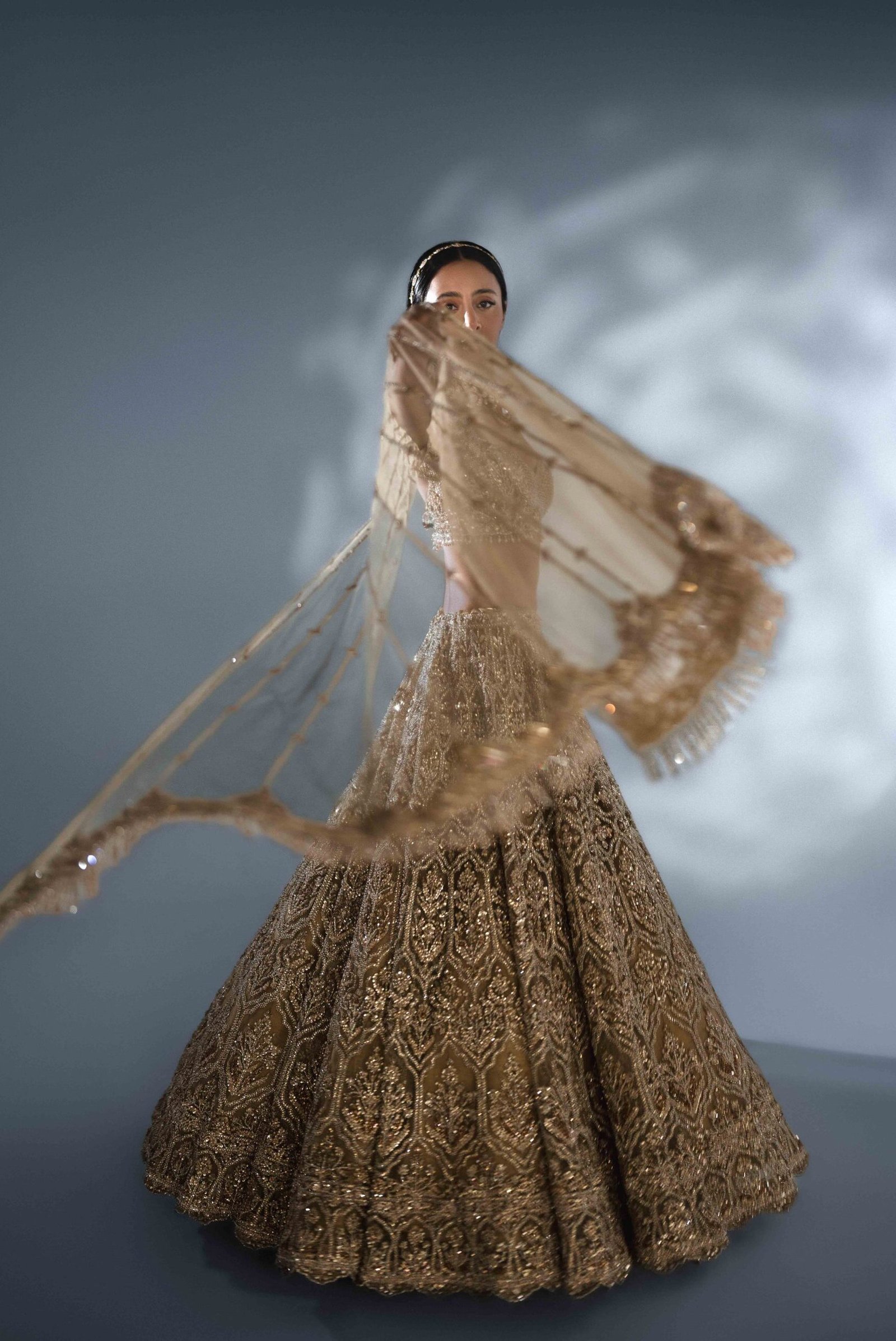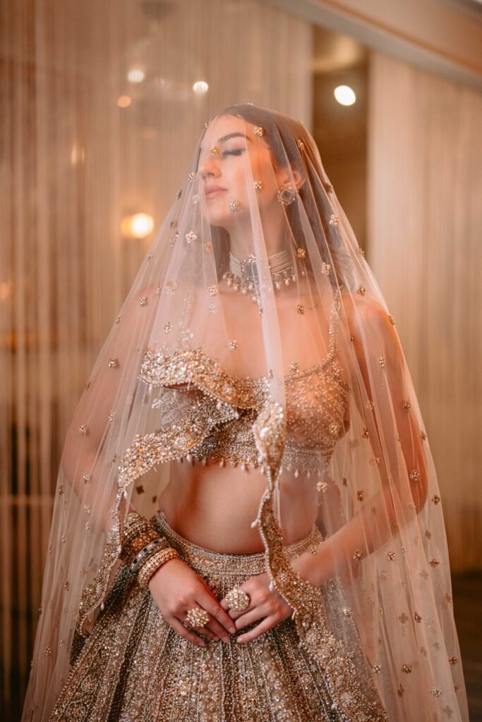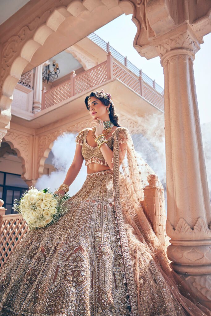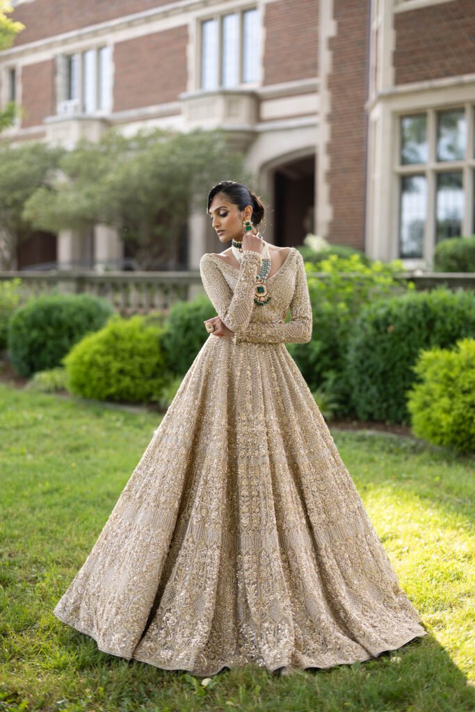 The Bella Bridal ensemble is the embodiment of a regal fantasy. Crafted for the grandest occasion, this piece is an intricate tapestry of the finest silk and thousands of meticulously placed hand-sewn crystals and zardozi.