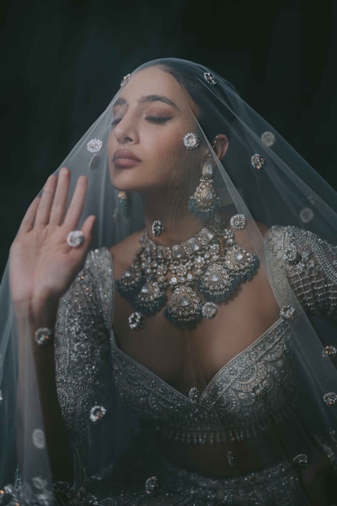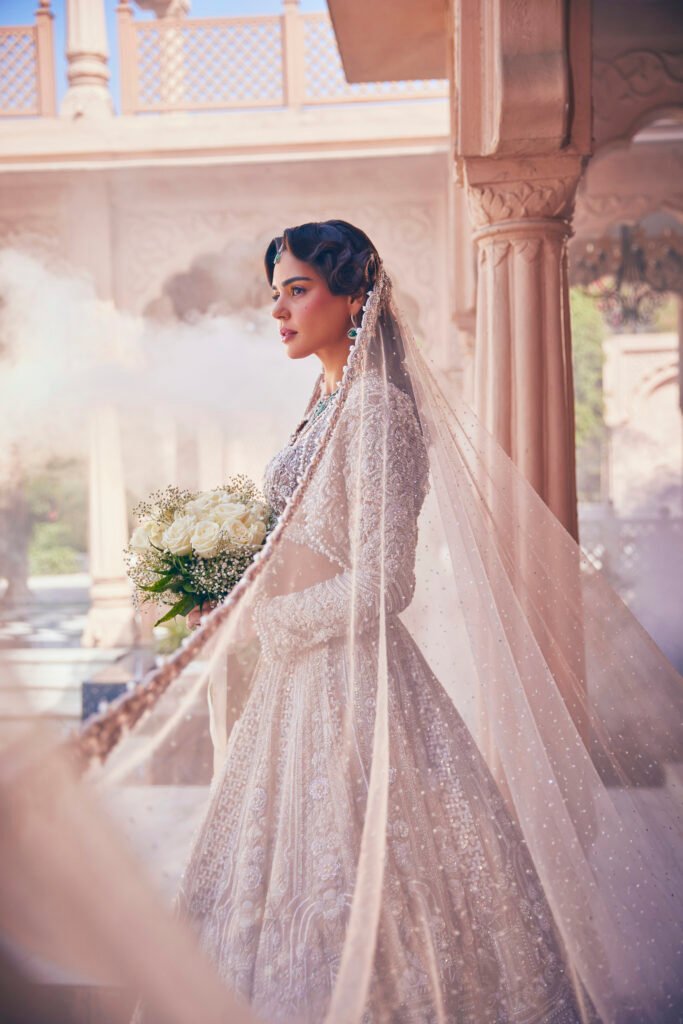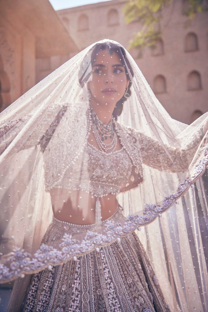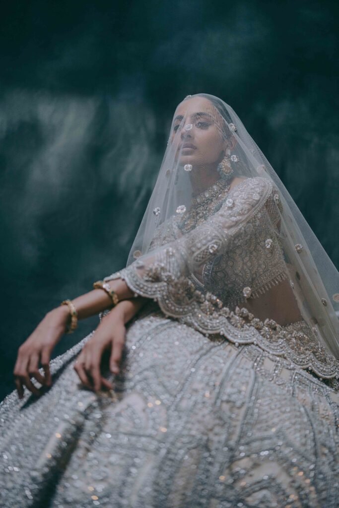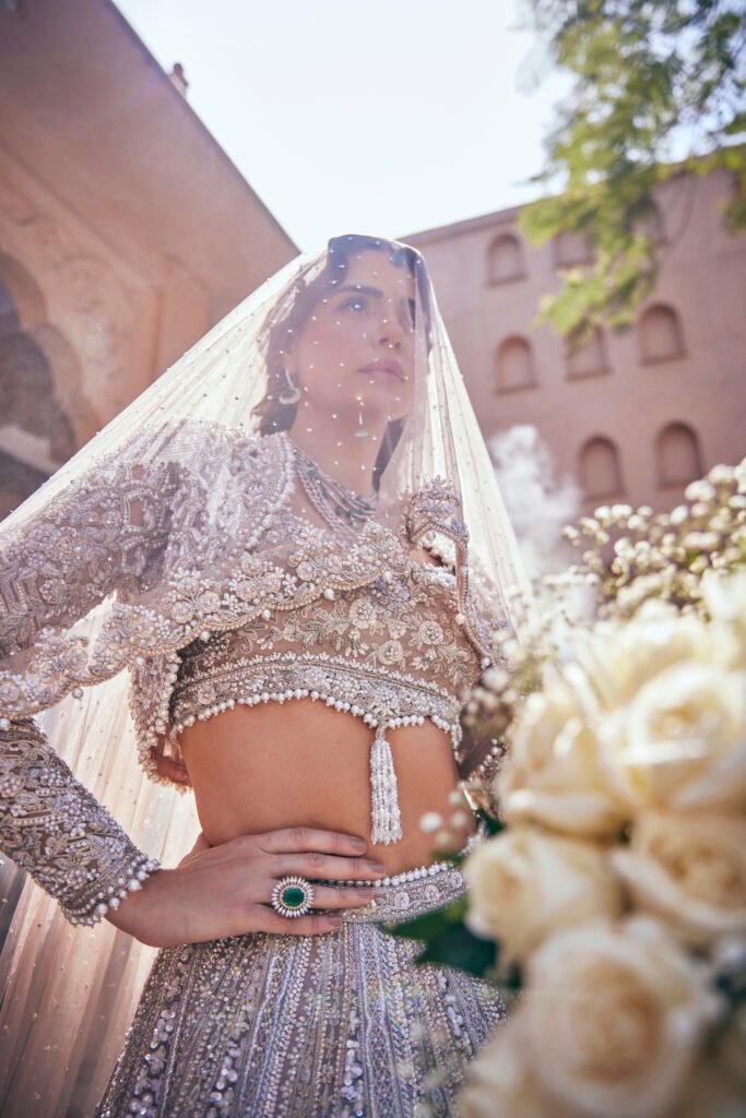 Named for brilliance and shimmer, the Zarin Bridal piece embodies contemporary royalty. This ensemble features a flowing silhouette and is blanketed in meticulous silver-thread hand-embroidery, giving it a celestial glow.